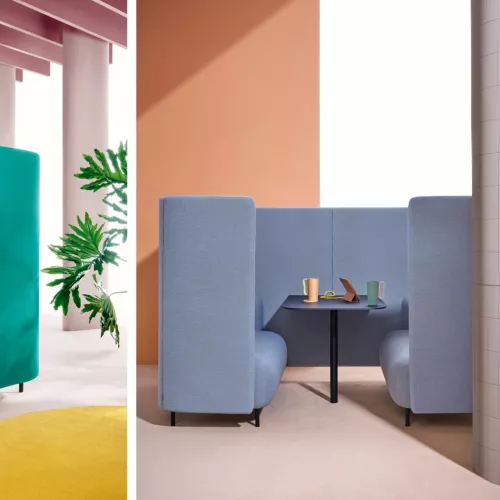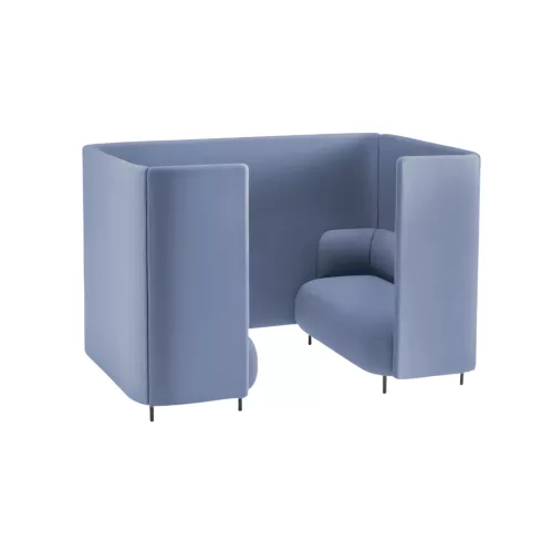 Deze functionele en efficiënte zitoplossing creëert een geïsoleerde nis die zowel akoestische als visuele privacy biedt, perfect afgestemd op de hedendaagse kantoortrends. Een omhullend, geluidsabsorberend paneel omhult het zitgedeelte en vormt een uitnodigende, afgesloten nis, ideaal voor geconcentreerd werken, ontspannen gesprekken of momenten van rust. Twee units kunnen tegenover elkaar worden geplaatst en met een centraal paneel met elkaar worden verbonden, waardoor de compositie een informele ontmoetingsplek of pauzeruimte wordt. De box met vier zitplaatsen is gemaakt van geïnjecteerd polyurethaanschuim, ondersteund door elastische banden, met rugleuning en armleuningen van hetzelfde veerkrachtige schuim, alles gemonteerd op een duurzaam stalen frame en verfijnde aluminium poten.