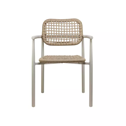 Deze terrasstoel heeft een stevig aluminium frame met een duurzame poedercoating en is geschikt voor intensief buitengebruik. De geïntegreerde armleuningen zorgen voor extra zitcomfort en geven het ontwerp een evenwichtige uitstraling. Verkrijgbaar in groen, beige/zand en charcoal/marineblauw, met bijpassende hoge en lage barkruk. De stoel is stapelbaar en daardoor praktisch en ruimtebesparend voor horecaterrassen.