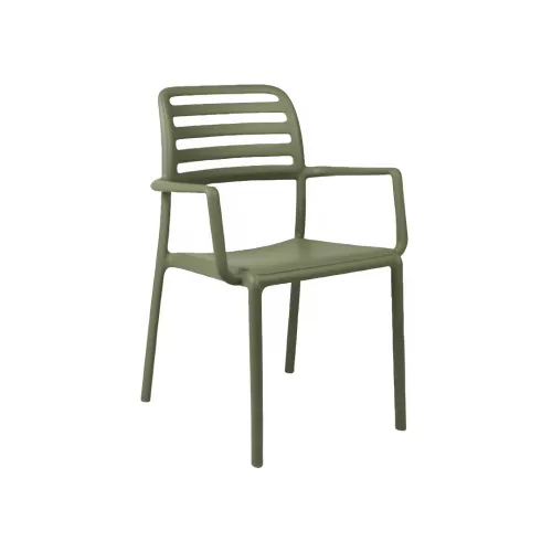 Costa is een stijlvolle buitenstoel met armleuningen, gemaakt van glasvezelversterkt polypropyleen met UV-additieven. Het lattenontwerp en het afgeronde frame zorgen voor comfort en gebruiksgemak. Stapelbaar en licht — perfect voor horeca.