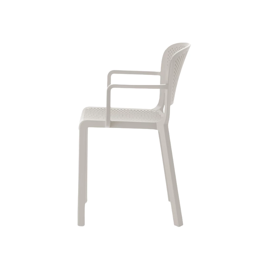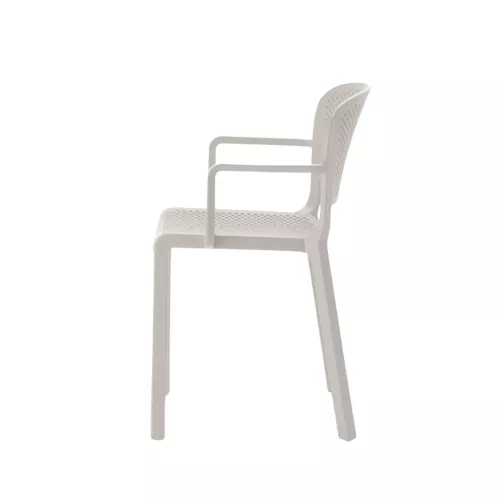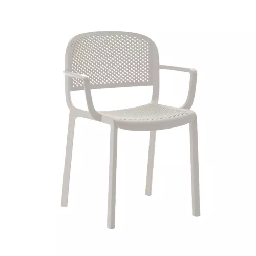Dome 266 is een buitenstoel met armleuningen, gemaakt van duurzaam polypropyleen. De geperforeerde zitting en rug zorgen voor comfort en ventilatie. UV-bestendig, antistatisch en stapelbaar. Ideaal voor elke horecaterras.