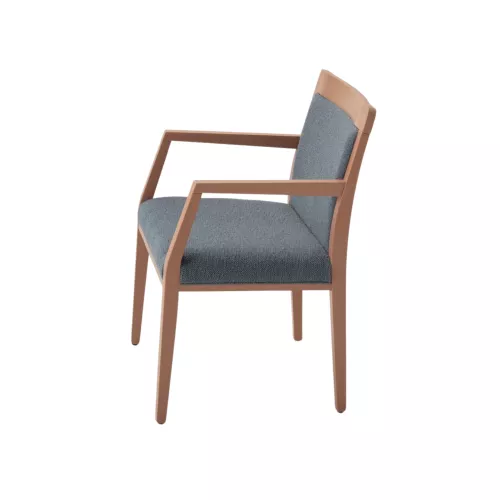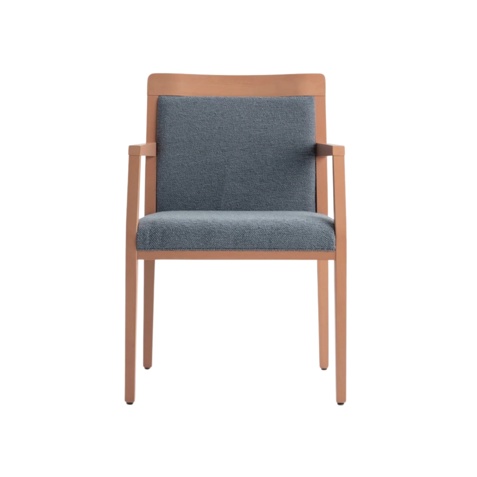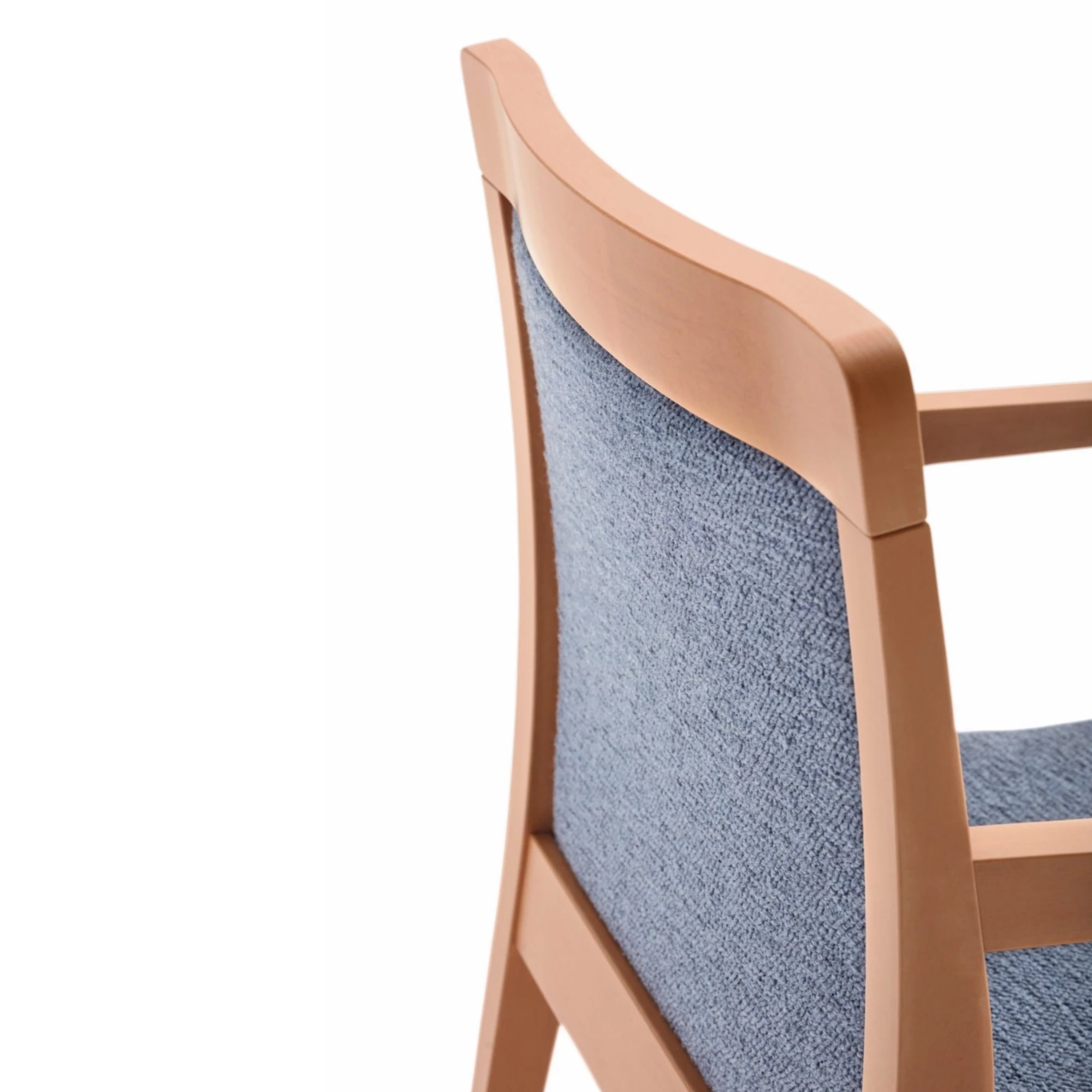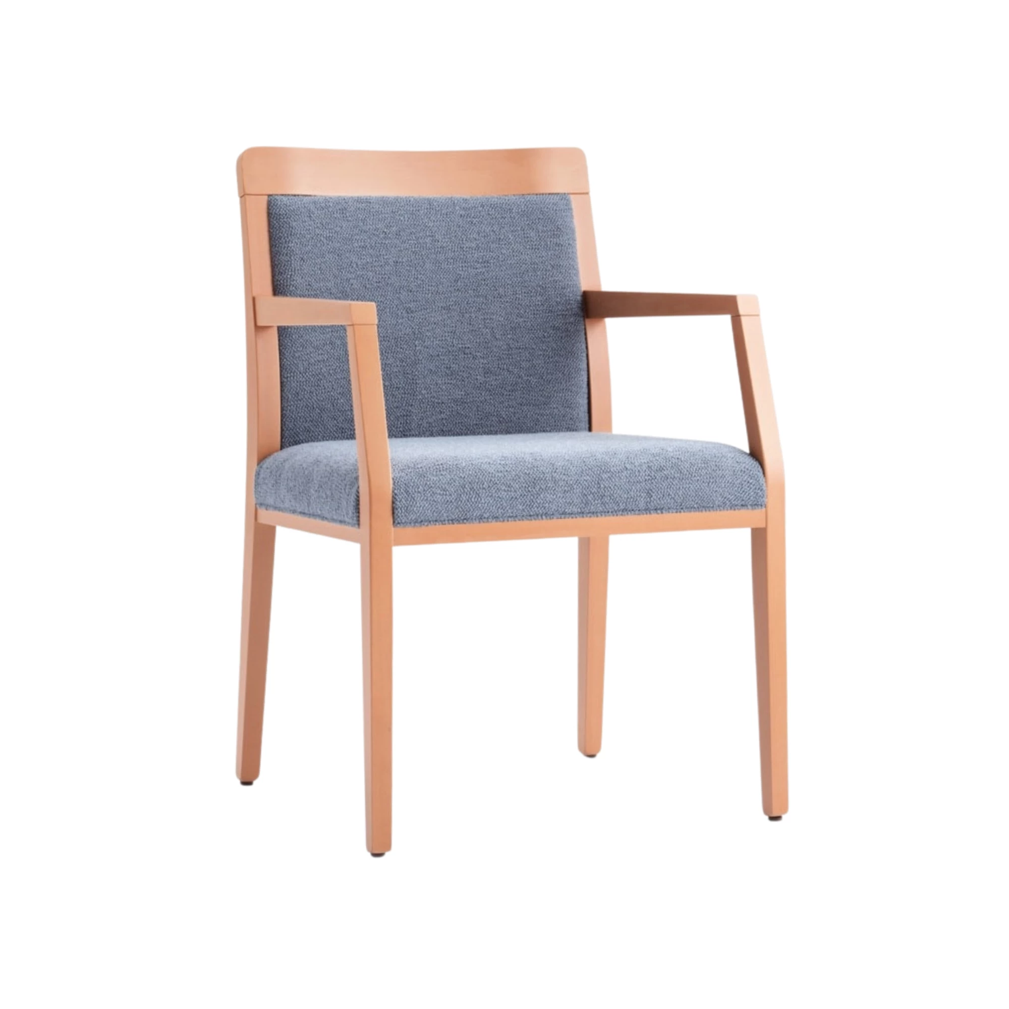 Dubai A is een gestoffeerde stoel met armleuningen, zitting en rugleuning. Het frame is van beukenhout, gelakt met polyurethaan en beschikbaar in verschillende beitskleuren. De bekleding is mogelijk in professionele stoffen of kunstleer, ideaal voor intensief horeca-gebruik. Dankzij zijn vele personalisatiemogelijkheden past hij in elke interieurstijl.