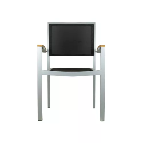 De George Silver / Black Textilene stoel is de perfecte combinatie van duurzaamheid en stijl, ontworpen voor terrasrestaurants, cafés en bistro's. Het stevige aluminium frame van 22221,8mm is gepoedercoat voor extra duurzaamheid en UV-bestendigheid, waardoor het een uitstekende keuze is voor buitenomgevingen. De Textilene bekleding biedt hoog comfort, is ademend en droogt snel, wat zorgt voor optimaal comfort voor uw gasten. De armleuningen bieden extra ontspanning en gemak. Het ontwerp is stapelbaar, 24 stoelen kunnen per eenheid gestapeld worden, ideaal voor het besparen van ruimte in minder drukke tijden. Of u nu een moderne buiten eetruimte wilt creëren of een bestaande ruimte wilt upgraden, de George Silver / Black Textilene stoel combineert functionaliteit, comfort en tijdloos design.