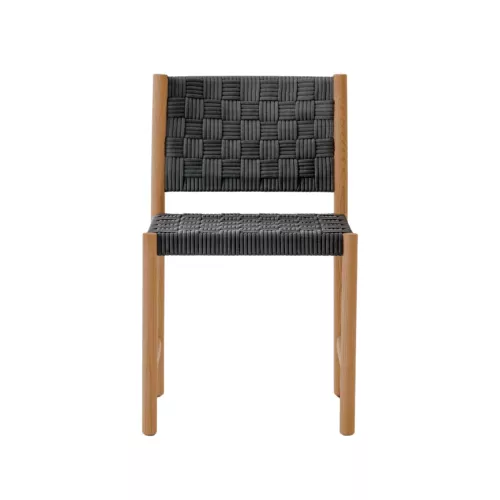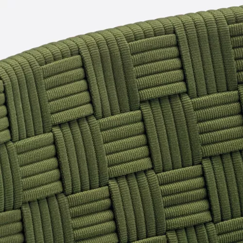 Griante herinterpreteert het concept van geweven zitmeubilair met een ontwerp dat traditioneel vakmanschap combineert met moderne, industriële precisie. De cilindrische poten zijn subtiel gedraaid, terwijl het aluminium frame zorgt voor een stevige ondersteuning van de zitting. Het onderscheidende kenmerk van Griante ligt in de handgeweven zitting en rugleuning, vervaardigd in Italië van volledig recyclebare polypropyleen garenbanden met een verfijnde driedimensionale textuur. Het geweven patroon, gedefinieerd door een geometrische herhaling van vierkante vormen, accentueert de royale afmetingen van de zitting en versterkt de elegante, uitnodigende esthetiek. Het resultaat is een stoel die verfijning, comfort en een tijdloos design uitstraalt, maar tegelijkertijd eenvoudig te demonteren en milieuvriendelijk is.
