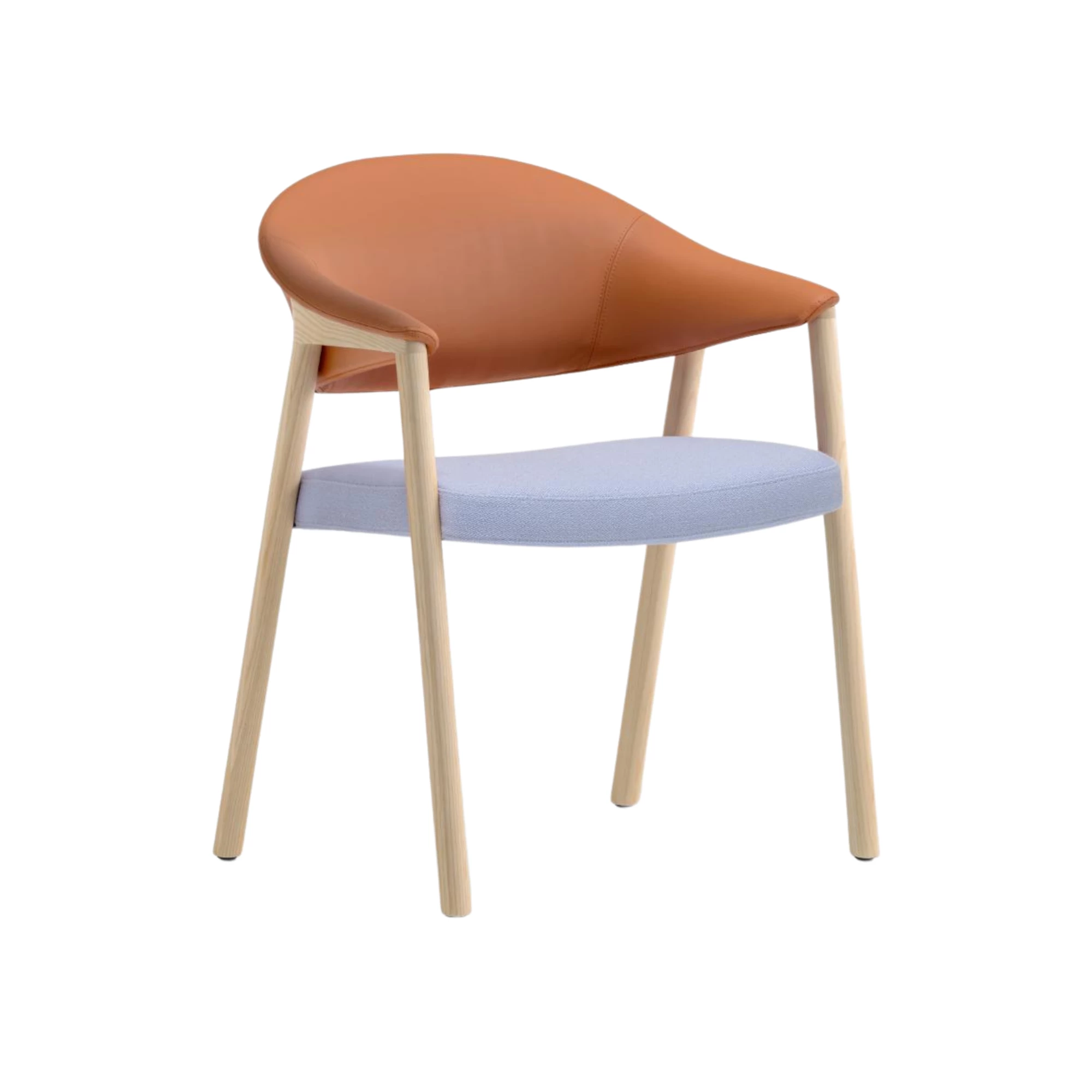 Gedefinieerd door zachte rondingen en een verleidelijk gevoel van comfort, brengt deze stoel een nieuwe dimensie van comfort in elke verfijnde omgeving. Het frame, vervaardigd in essenhout of Amerikaans notenhout, omarmt een ergonomische rugleuning van geïnjecteerd polyurethaanschuim, die een zachte en omhullende ondersteuning biedt. De royale zitting, bekleed met polyurethaanschuim en verstevigd met elastische banden, nodigt uit tot lange momenten van ontspanning. Rustend op ovale poten van massief hout, voelt het silhouet vloeiend en harmonieus aan, waardoor het een prachtige keuze is voor prestigieuze horecagelegenheden zoals elegante restaurants en hotels, maar ook voor verfijnde wooninterieurs.