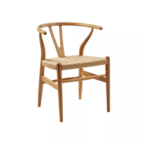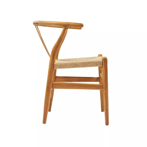 Buitenarmstoel van duurzaam teakhout met zitting en rugleuning van hoogwaardig synthetisch riet. Geschikt voor terrassen, tuinen en horecagelegenheden in de buitenlucht. Afmetingen: 58x57x73 cm.