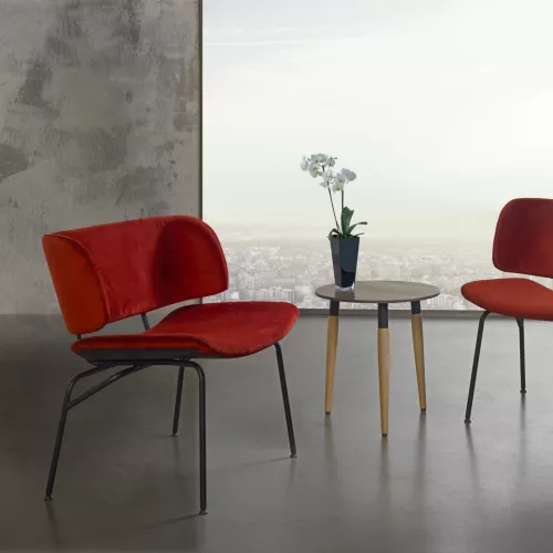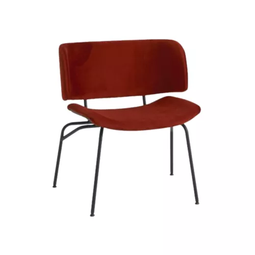 De July Lounge is een stijlvolle loungestoel met een metalen frame en een gebogen, beklede rugleuning voor extra comfort. Het frame is verkrijgbaar in elke RAL-kleur en de stoffering in een brede selectie stoffen of kunstleer. Perfect voor moderne interieurs.