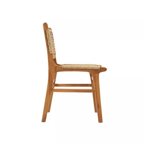 Stoel gemaakt van teakhout met een zitting en rugleuning gevlochten uit synthetisch rotan. De combinatie van massief hout en duurzaam vlechtwerk zorgt voor een natuurlijke uitstraling en maakt de stoel geschikt voor horeca-interieurs en terrassen.