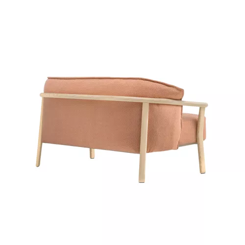 Een delicate tweezitsbank die zijn schoonheid vindt in contrast: de stille elegantie van een houten frame gecombineerd met de zachte, royale omhelzing van omhullende kussens. De massief essenhouten structuur heeft afgeronde armleuningen die met stoom zijn gebogen en naadloos overgaan in ovale poten die het meubel een warme, ambachtelijke uitstraling geven.