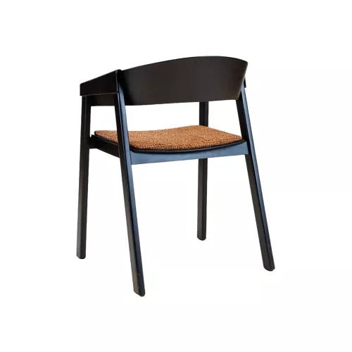 Minimalistische eiken stoel met armleuningen en een sterke constructie van massief hout. De armleuningen zorgen voor extra ondersteuning, terwijl houtafwerkingen en stoffering volledig aanpasbaar zijn. Geschikt voor eigentijdse horeca-inrichtingen.