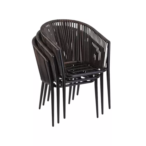 Stapebare terrasstoel met zwart gepoedercoat aluminium frame. Zitting en rugleuning hebben een afgerond ontwerp van bruin polyethyleen (P.E.). Wordt geleverd met een antracietkleurig zitkussen. UV- en weerbestendig – perfect voor horeca buitentoepassingen.