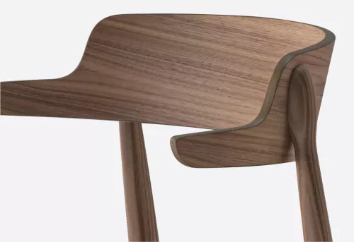 De Nemea 2825 fauteuil combineert klassieke elegantie met praktisch gemak. Met een gevormde zitting en rug van essenhoutfineer, een stevig aluminium frame en poten van massief essen- of walnoothout. De armleuningen maken het mogelijk de stoel op tafel te hangen—handig bij schoonmaken of opbergen.