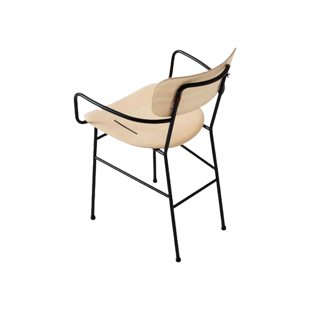 De Piuma PM LG stoel met armleuningen combineert lichtheid, elegantie en veelzijdigheid. Het metalen onderstel met vier poten ondersteunt een gefineerde houten zitting en rugleuning, aangevuld met zichtbare metalen inzetstukken en zwarte knoppen voor een verfijnde look. Zowel het frame als de zitting zijn aanpasbaar en ideaal voor moderne horecagelegenheden en veelzijdige interieurs.