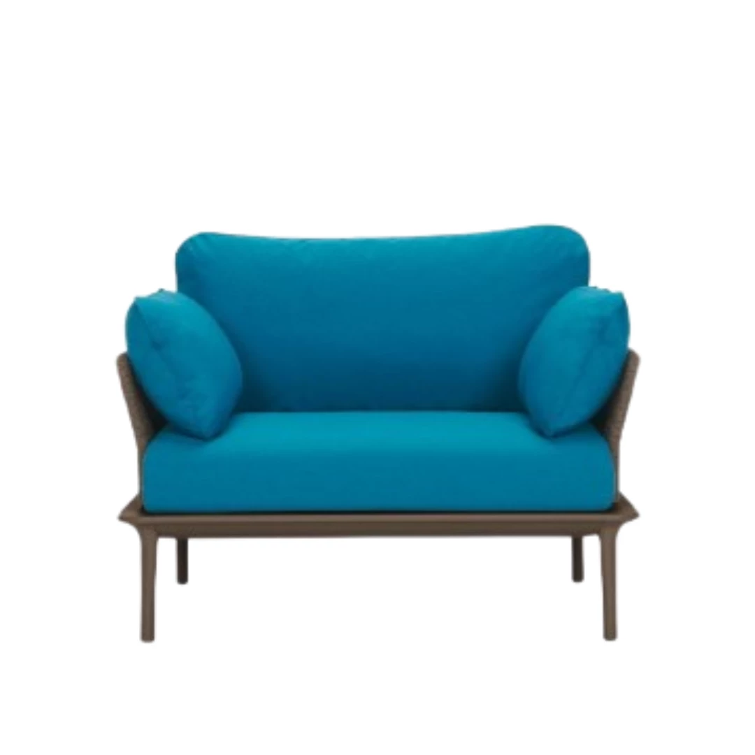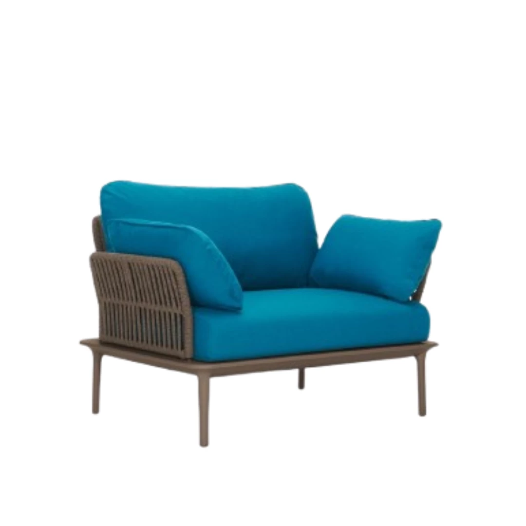 REVA-2_P is een stijlvolle fauteuil met een gepoedercoat aluminium frame en een stalen rugleuning en armleuningen, geweven met plat, waterbestendig polypropyleen touw. Het waterdichte gaas en de gestoffeerde kussens van outdoorstof maken hem perfect voor hotellounges binnenshuis, en combineren duurzaamheid met comfort en modern design.