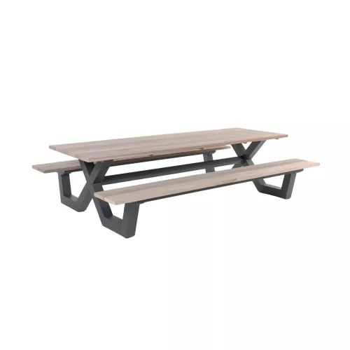 Riccardo is een robuuste buiten tafel- en bankenset met opvallend kruisframe. Het lichte, roestvrije aluminium frame is verkrijgbaar in wit of zwart en afgewerkt met een teakhouten blad. Perfect voor scholen, parken of bedrijfsruimtes – duurzaam en weerbestendig.