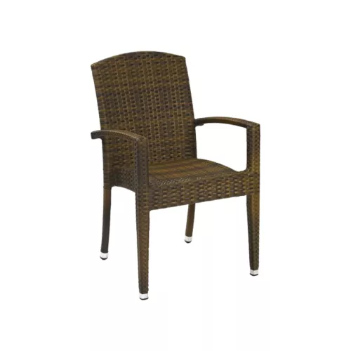 Titus Brown A is een outdoor stoel met armleuningen, voorzien van een gepoedercoat aluminium frame en een zitvlak/rugleuning van plat P.E.-Wicker in gebrande kleur. UV- en weerbestendig, stapelbaar tot 8 stuks. Ideaal voor elke horeca buitenruimte. Optioneel verkrijgbaar met waterafstotend zitkussen.