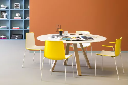 De armstoel Tweet 895 combineert een strak dubbel geïnjecteerde polypropyleen kuip met geïntegreerde armleuningen en een Ø14 mm stalen buizenframe in chroom of poedercoating. Antistatisch en UV-bestendig, stapelbaar tot 10 stuks, uni- of bicolor.