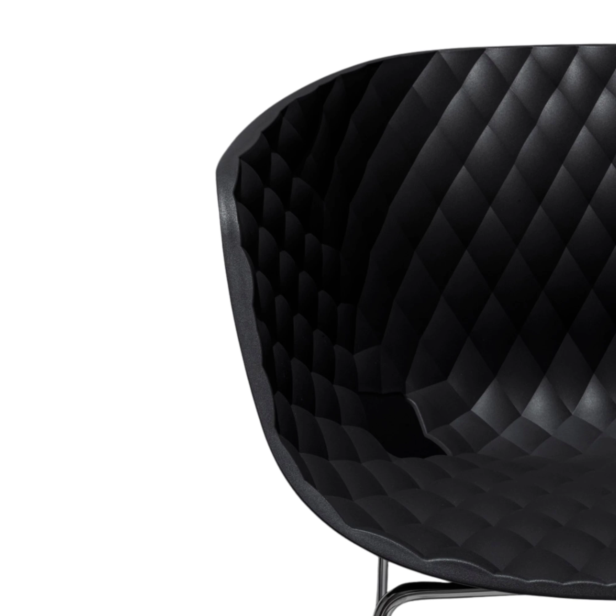 De Uno 594 is een elegante designfauteuil met een stevig stalen frame op vier poten en een comfortabele zitschaal van polypropyleen. Het metalen onderstel is verkrijgbaar in een verchroomde uitvoering of met een poedercoating die geschikt is voor buitengebruik, in zwart of wit. Op aanvraag kan de stoel worden geleverd met een speciale behandeling voor volledige outdoorbestendigheid. Snelle levering is mogelijk voor de versie met zwarte schaal op zwart frame en de versie met witte schaal op wit frame.