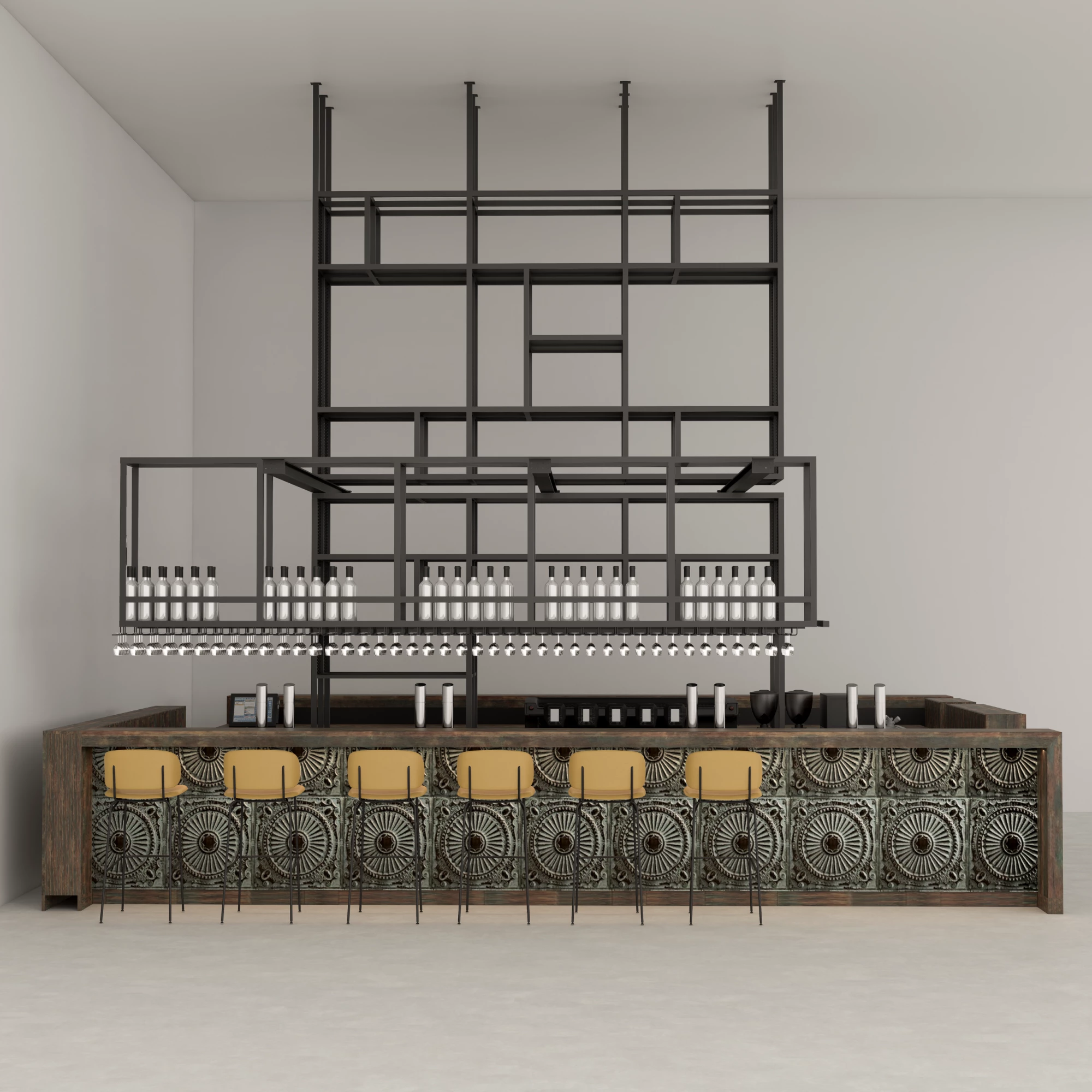 Het hangframe en het achterwandframe zijn gemaakt van 4x4 cm metalen profielen, zwart gepoedercoat, met geïntegreerde haken voor wijnglazen. De zijpanelen hebben een metalen gaasafwerking, wat industriële elegantie en subtiele transparantie toevoegt. De planken van HPL met fineerhoutlook weerspiegelen het serviceblad en completeren een samenhangend en tactiel materiaalpalet.