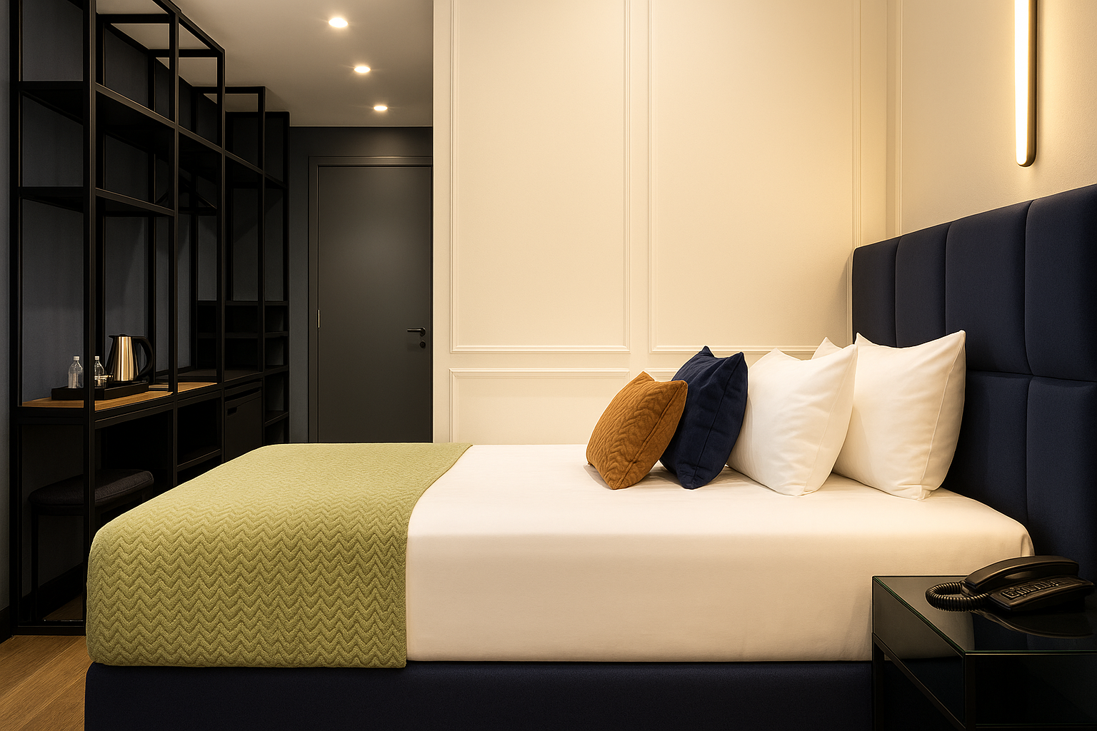 Afhankelijk van het project bieden we twee benaderingen: vooraf samengestelde kamerconcepten of volledig custom made interieurconcepten. Onze modulaire hotelkamerconcepten zijn ideaal voor projecten waarbij snelheid, uniformiteit en budgetcontrole belangrijk zijn. Ze combineren comfort, uitstraling en efficiënt gebruik in één helder concept.