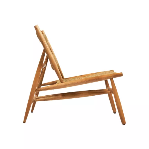 Houten loungestoel met zitting en rugleuning gevlochten uit rotankoord.