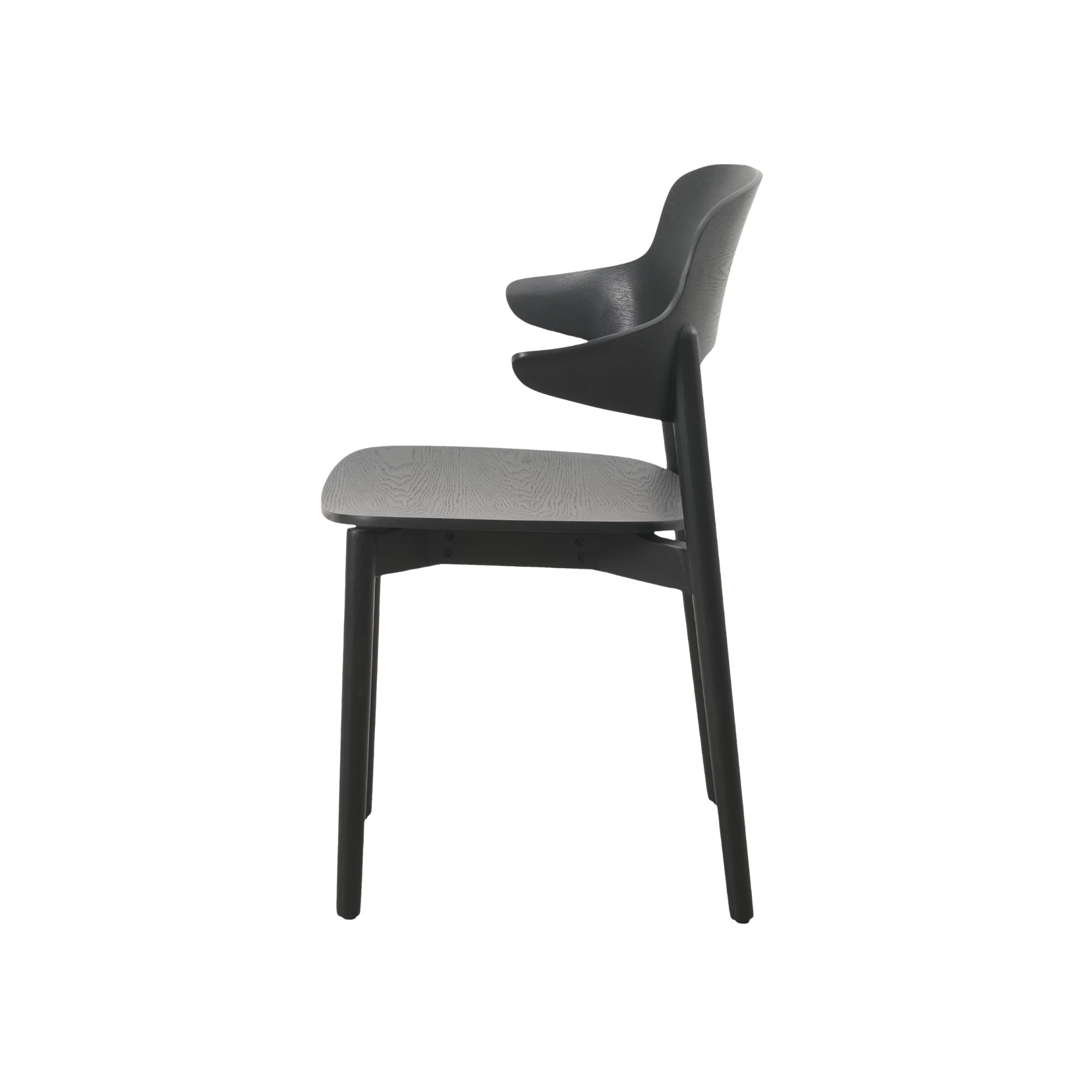 Moderne stoel van massief eikenhout met geïntegreerde armleuningen.