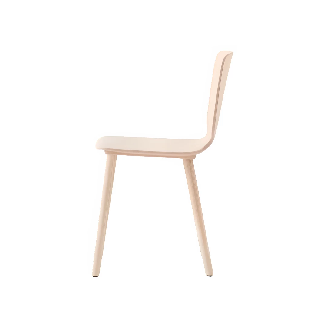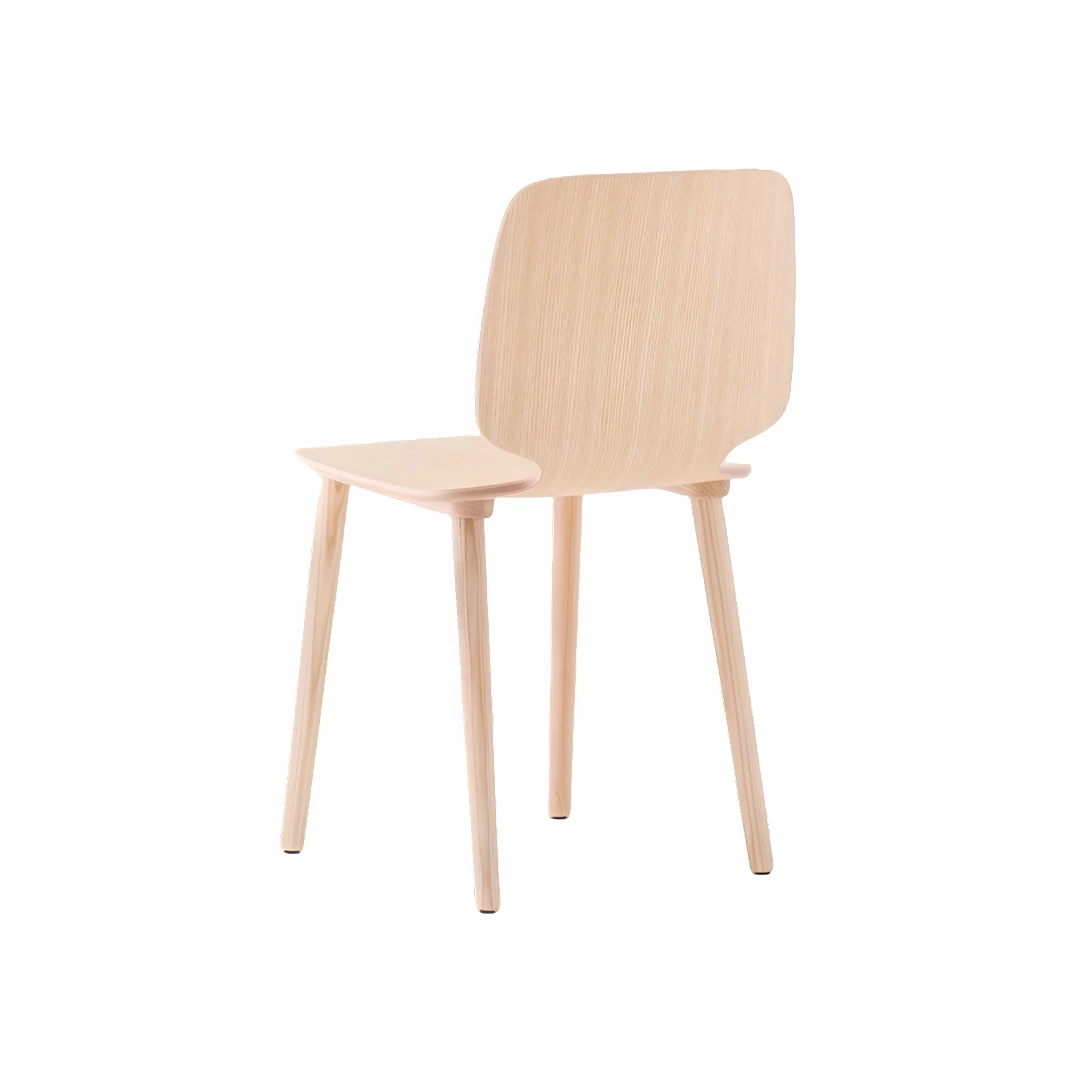 De zitting is gemaakt van essenhouten fineer met variabele dikte, wat zorgt voor een ergonomische vorm die visuele lichtheid en comfort combineert. De massief essenhouten poten bieden stevige ondersteuning en natuurlijke elegantie, waardoor de stoel geschikt is voor uiteenlopende omgevingen – van moderne eetkamers tot stijlvolle kantoorruimtes.