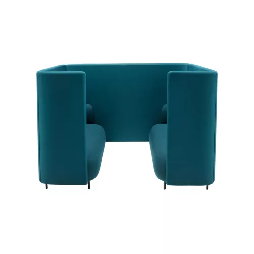 Deze functionele en efficiënte zitoplossing creëert een geïsoleerde nis die zowel akoestische als visuele privacy biedt, perfect afgestemd op de hedendaagse kantoortrends. Een omhullend, geluidsabsorberend paneel omhult het zitgedeelte en vormt een uitnodigende, afgesloten nis, ideaal voor geconcentreerd werken, ontspannen gesprekken of momenten van rust. Twee units kunnen tegenover elkaar worden geplaatst en met een centraal paneel met elkaar worden verbonden, waardoor de compositie een informele ontmoetingsplek of pauzeruimte wordt. De box met vier zitplaatsen is gemaakt van geïnjecteerd polyurethaanschuim, ondersteund door elastische banden, met rugleuning en armleuningen van hetzelfde veerkrachtige schuim, alles gemonteerd op een duurzaam stalen frame en verfijnde aluminium poten.