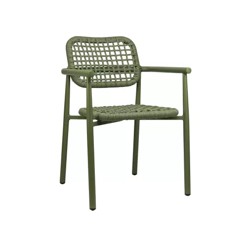 Deze terrasstoel heeft een stevig aluminium frame met een duurzame poedercoating en is geschikt voor intensief buitengebruik. De geïntegreerde armleuningen zorgen voor extra zitcomfort en geven het ontwerp een evenwichtige uitstraling. Verkrijgbaar in groen, beige/zand en charcoal/marineblauw, met bijpassende hoge en lage barkruk. De stoel is stapelbaar en daardoor praktisch en ruimtebesparend voor horecaterrassen.