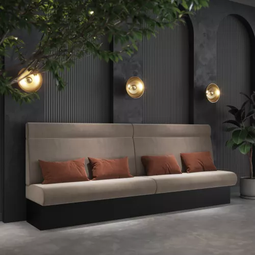 De Donald + Sockle met hoofdsteun is ontworpen om comfort en stijl te bieden in elke horecaruimte. Deze bank heeft een stevig beukenhouten frame, berkenhouten poten en een sockle met zwarte of standaard melamine afwerking – ideaal voor langdurig gebruik in drukke interieurs. De hoofdsteun zorgt voor extra comfort, terwijl de achterzijde ongestoffeerd is, wat het perfect maakt voor plaatsing tegen muren of vaste opstellingen. Verkrijgbaar in twee uitvoeringen: 3 meter per 1 meter voor ongestoffeerde achterzijde, en 4 meter per 1 meter voor de volledig gestoffeerde variant. Donald + Sockle met hoofdsteun is dé keuze voor restaurants, cafés en bistro’s die comfort, stevigheid en uitstraling belangrijk vinden.