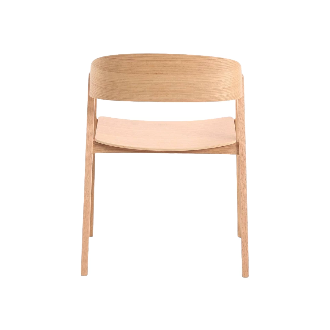Modern eiken stoel met geïntegreerde armleuningen en een vloeiend gevormde rugleuning. Gemaakt van hoogwaardig massief eikenhout, biedt deze stoel elegantie en duurzaamheid, perfect voor veeleisende HoReCa-omgevingen. Ontworpen om moderne eet- en loungeruimtes te verrijken met comfort en stijl.