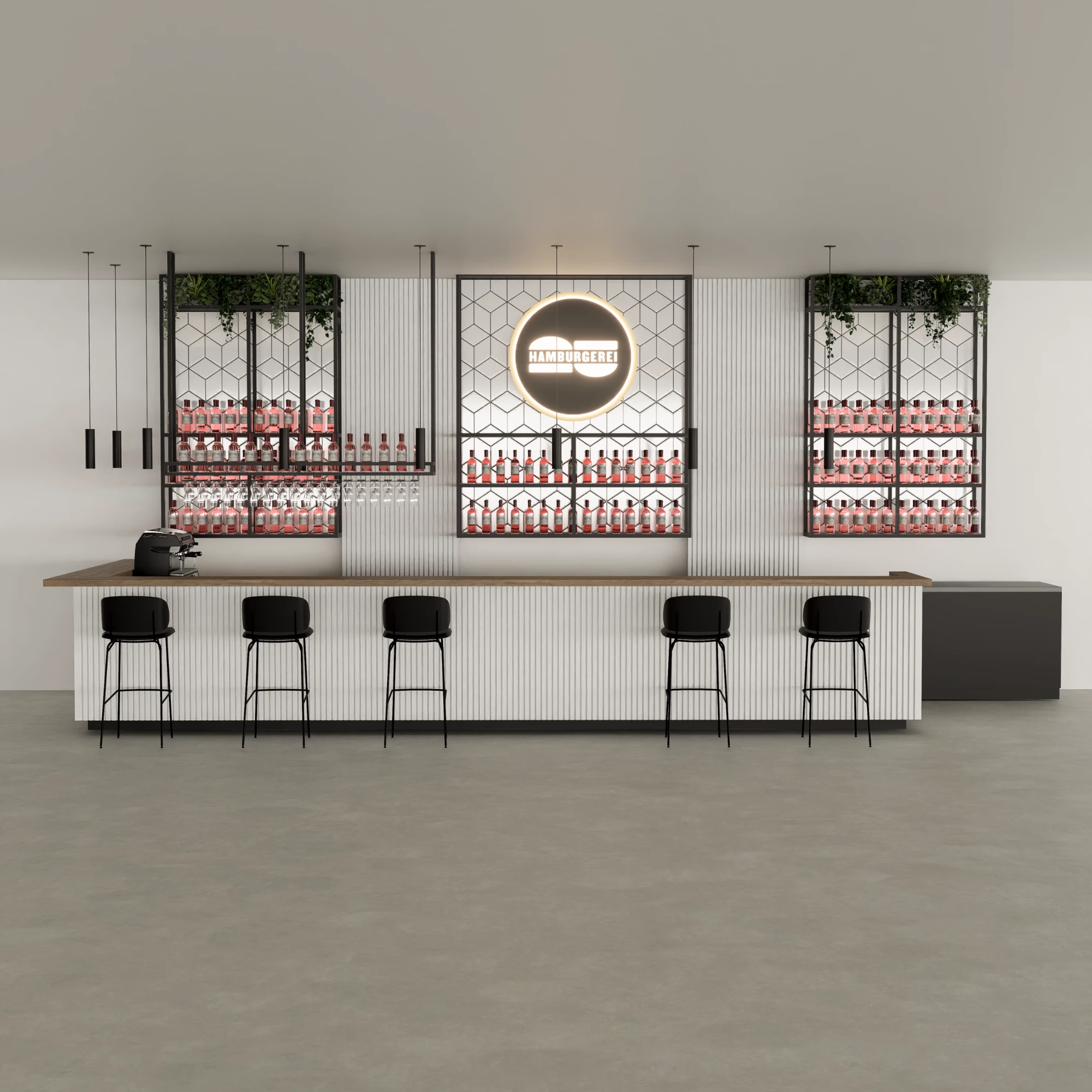 Deze bar combineert natuurlijke materialen, moderne texturen en architectonische stalen details tot een strak, eigentijds middelpunt dat past in elk stijlvol horeca-interieur.