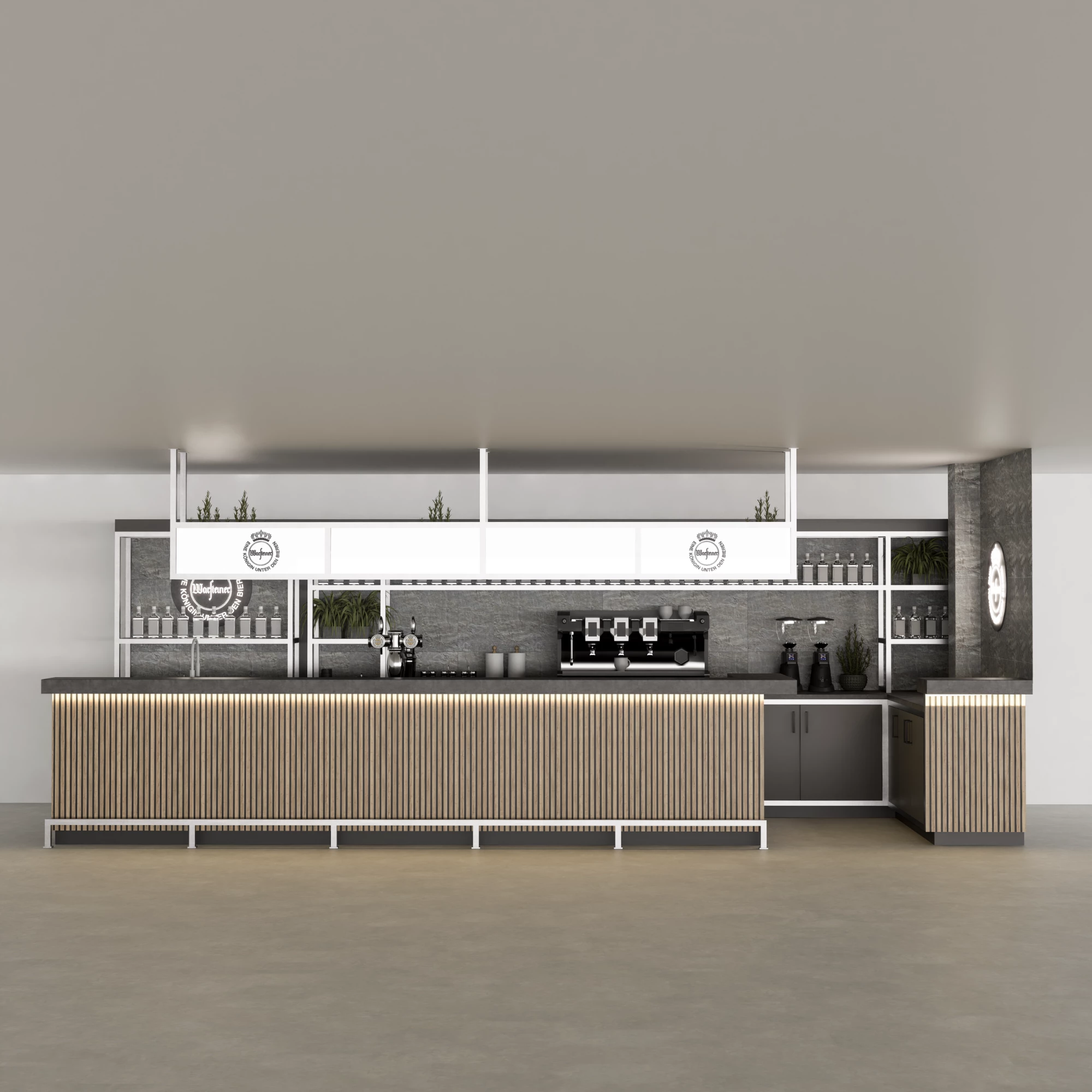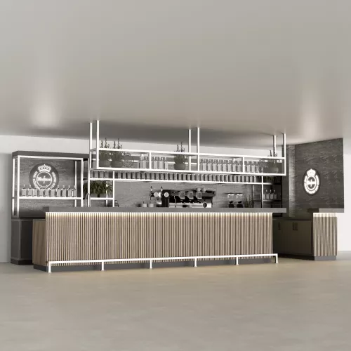 Een verfijnd, modern barconcept waarin natuurlijke texturen, koele metalen en warme verlichting samenkomen in een prachtig uitgebalanceerde compositie.