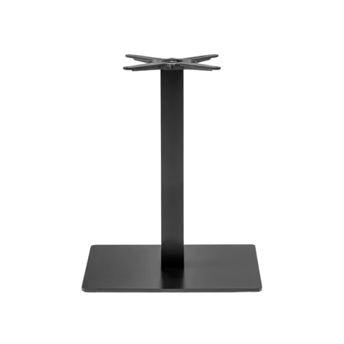 Tafel met een gezandstraalde gietijzeren voet in vierkante vorm, gecombineerd met een gepoedercoate stalen of roestvrijstalen kolom en bijpassende afdekplaat.