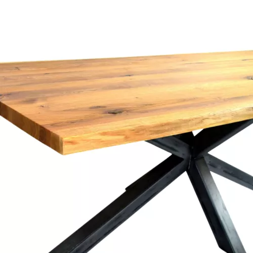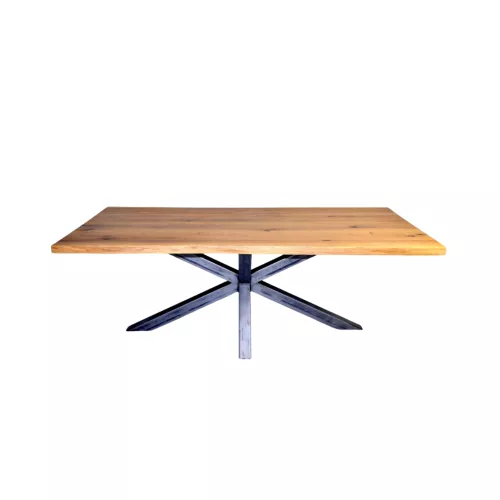 Tafel met een 2,8 cm dik blad van rustiek eiken en een dubbel X-frame van staal (8x8 cm). Onderstel van onbehandeld staal, blad geschaafd en geschuurd. Verkrijgbaar in diverse afmetingen, hoogte tot blad: 78 cm.