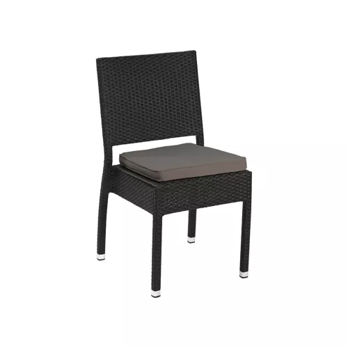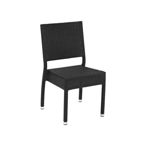 Mond S is een horecastoel voor buitengebruik, met een gepoedercoat aluminium frame en een zitting/rugleuning van zwart plat P.E.-wicker. UV- en weerbestendig, stapelbaar tot 8 stuks – perfect voor terrassen en buitenlocaties.