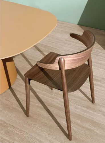 De Nemea 2825 fauteuil combineert klassieke elegantie met praktisch gemak. Met een gevormde zitting en rug van essenhoutfineer, een stevig aluminium frame en poten van massief essen- of walnoothout. De armleuningen maken het mogelijk de stoel op tafel te hangen—handig bij schoonmaken of opbergen.