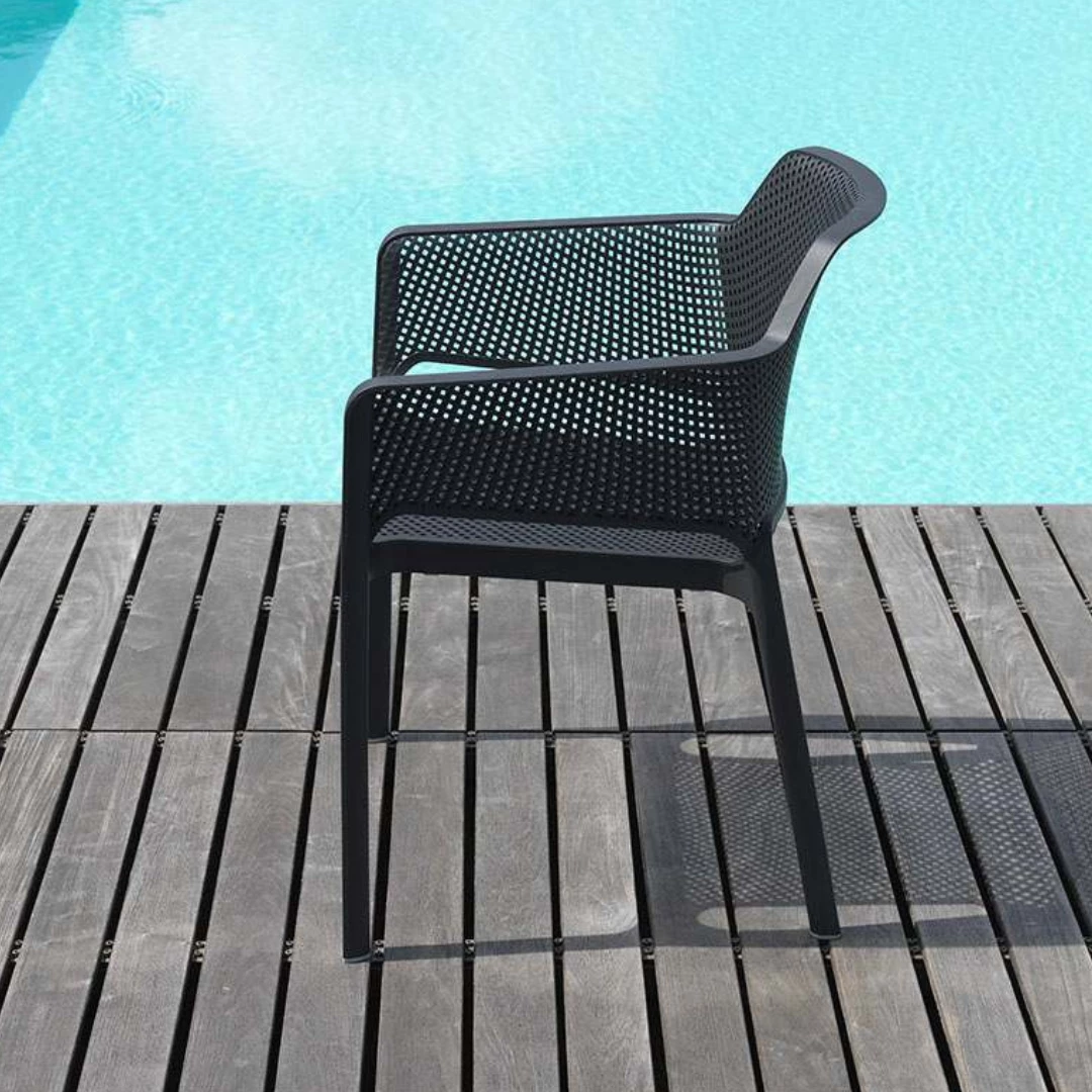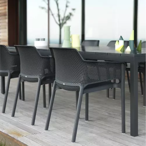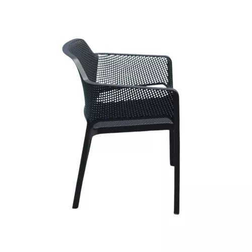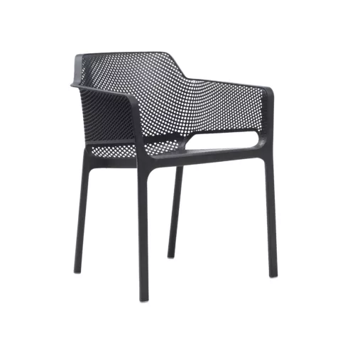 Net is een moderne buitenstoel voor horecagebruik, gemaakt uit één stuk polypropyleen met armleuningen. Het zitvlak heeft een stijlvol radiaal patroon van vierkante perforaties. UV- en weerbestendig, mat afgewerkt, beschikbaar in meerdere kleuren.
