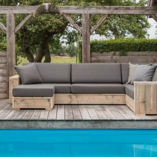 Bank van grenenhout met een ruwe afwerking, geschikt voor buitengebruik. Verkrijgbaar in white wash, black wash of transparante coating. De kussens zijn gemaakt van outdoor stof en beschikbaar in verschillende kleuren.