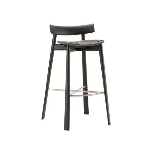 De Romeo BK W houten barkruk combineert een lichte, moderne esthetiek met uitzonderlijke structurele stevigheid. Gemaakt van essenhout met een roestvrijstalen voetensteun, gaan de poten elegant over van ellipsvormig naar plat. De zitting is gevlochten met papercord of polyester touw, terwijl de rugleuning stevigheid combineert met een verfijnde, minimalistische vorm.