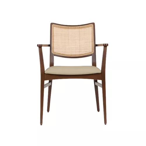 Soul A Wicker is een houten stoel met armleuningen, een beukenhouten frame in verschillende beitskleuren, een gestoffeerde zitting en een stijlvolle rugleuning van vlechtwerk. Licht, klassiek en comfortabel – geschikt voor elk HORECA-interieur.