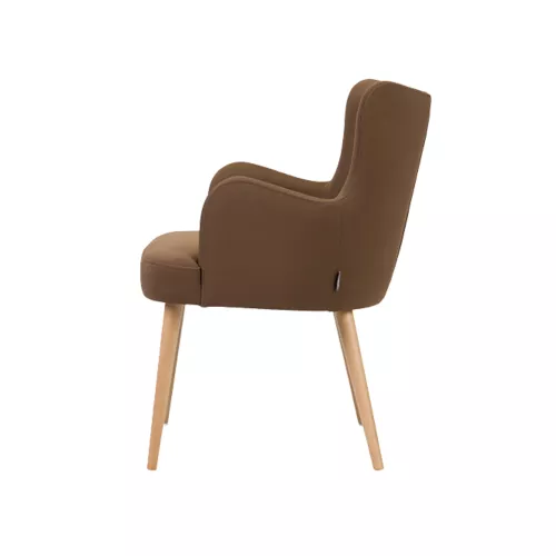 Tavro is een houten stoel met armleuningen in een stijlvol mid-century design. Het beukenhouten frame is verkrijgbaar in diverse beitskleuren. Met gestoffeerde zitting en rug in professionele stoffen of kunstleer is hij ideaal voor horeca.