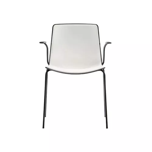 De armstoel Tweet 895 combineert een strak dubbel geïnjecteerde polypropyleen kuip met geïntegreerde armleuningen en een Ø14 mm stalen buizenframe in chroom of poedercoating. Antistatisch en UV-bestendig, stapelbaar tot 10 stuks, uni- of bicolor.