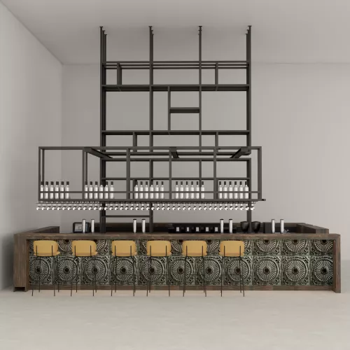 Een bar ontworpen voor moderne horecagelegenheden, waar warmte, metalen verfijning en architectonische stijl samenkomen in een verfijnd middelpunt.